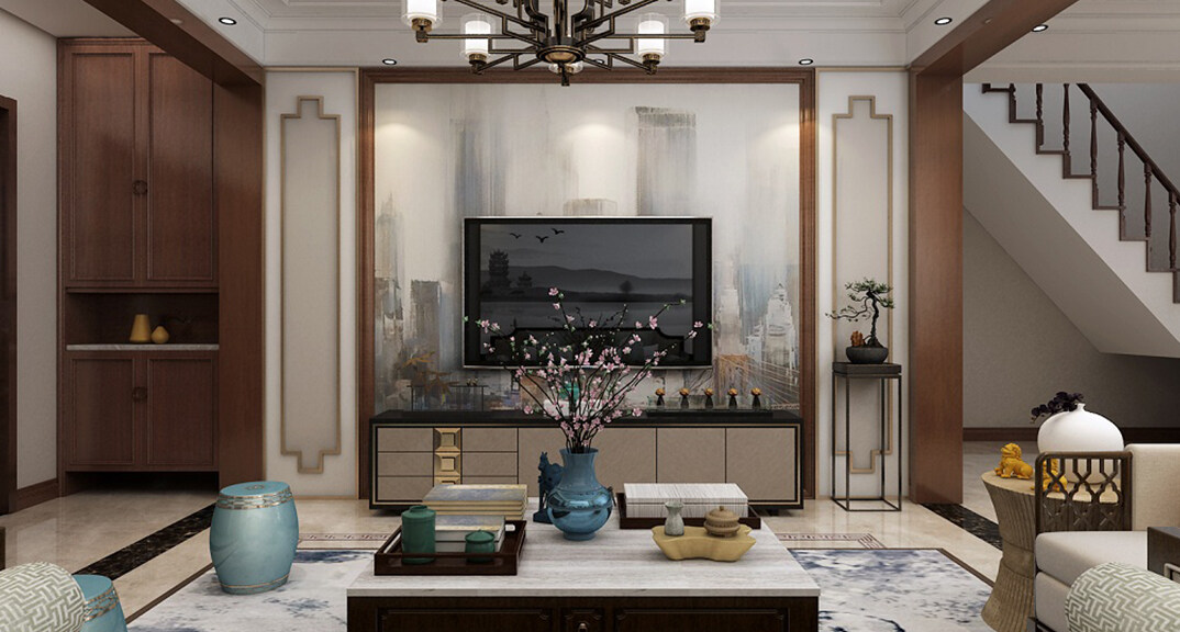 楓林小鎮230㎡別墅客廳電視新中式風格裝修案例效果圖
